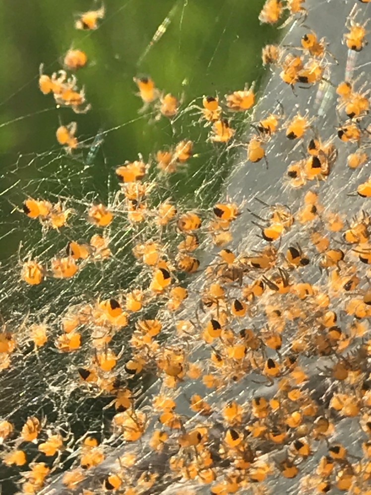 In the evening sun a huddle of baby spiders on a fence caught my eye. Perfect yellow spiderlings some with a distinctive black spot. These will grow into garden spiders. When they were laid in the Autumn the adult spider stayed with the sac until she died, the young spiders hatching now and soon to be off. When the silken threads are touched they all disperse at high speed but then come back together again into the centre. I have taken some photos and a little video.
