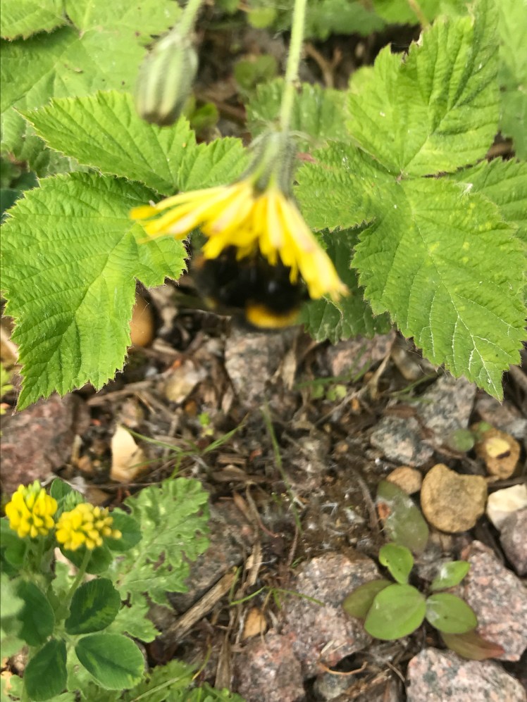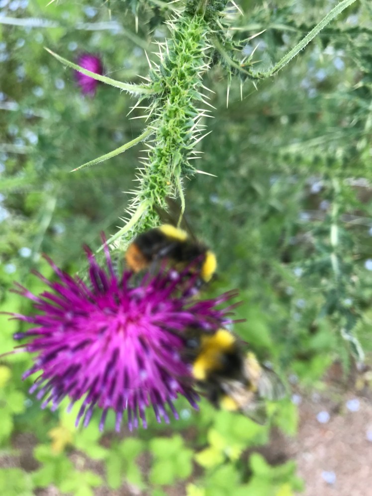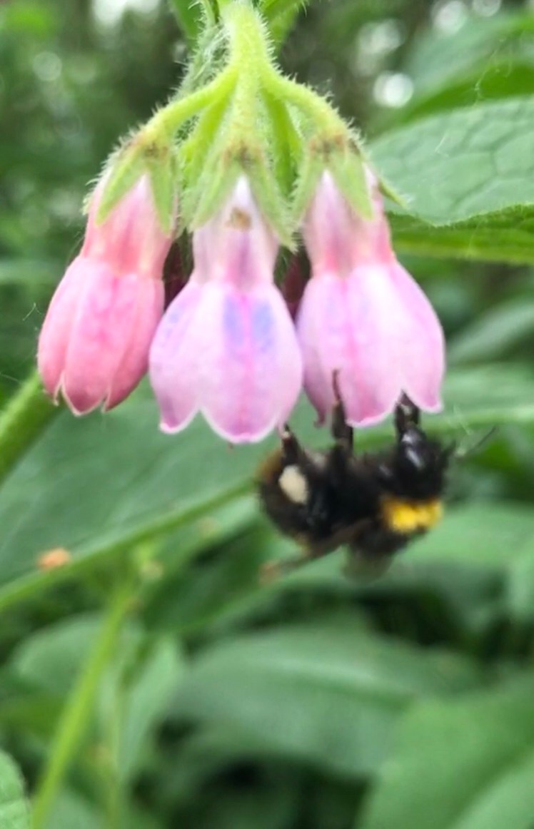 Bees- honey bees and bumble bees all busy on the masses of comfrey with pollen baskets full.
