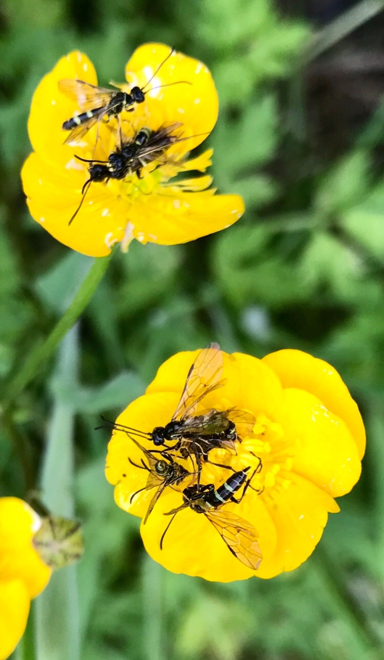 Along the edge of a field of wheat there were lots of tiny flying insects seemingly attracted to the buttercups lots of them mating. They were very small less than a cm long and very slender.