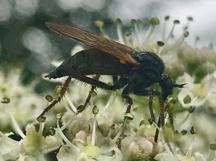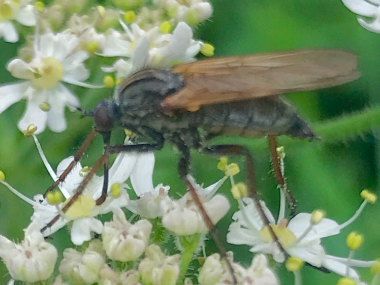 Daggerflies (Emis tessellata) we’re feeding in the hogweed umbels. They are nectar eaters but also predators that pierce their prey with their long probosis( hence the name) I thought their wings were great and their deadly profile.