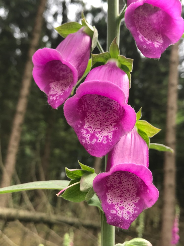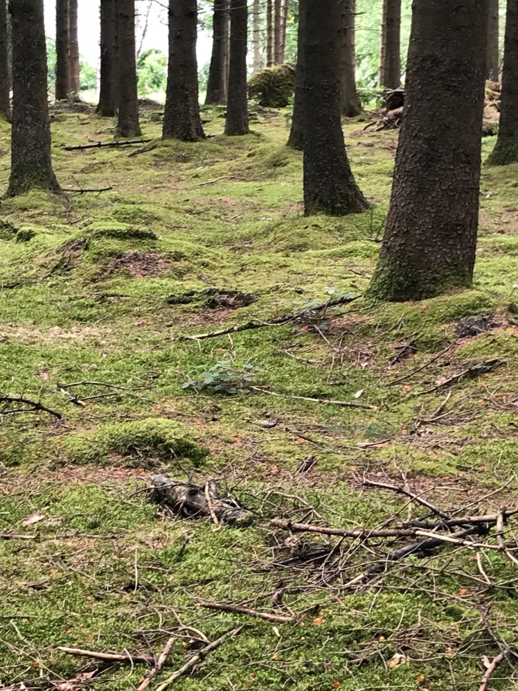 The fir cones were great littering the ground like confetti . Walking through mixed woods . The coniferous areas were carpeted in the softest moss rather like a posh carpet at the end of this corridor in the clearings were fantastic foxgloves.