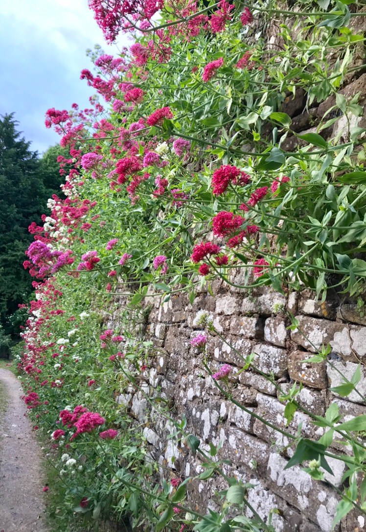 Further along the footpath down the side of another wall it was decorated with a sea of red valerian (Centranthus ruber)in all its shades.