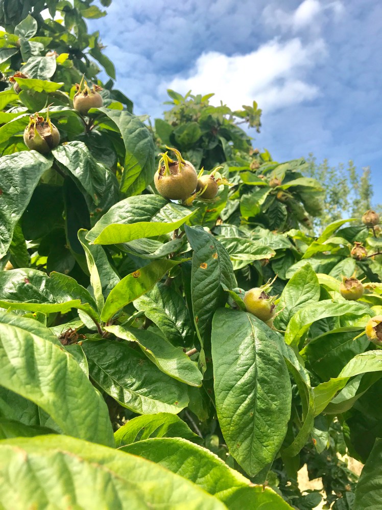 Unusually you cannot eat a medlar straight from the tree , it has to be bletted. This is s process of letting it ripen slowly in the cool until it is soft and squishy and brown !