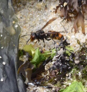 This huge hornet was spotted by Nature Table Explorer Rowan on a line of seaweed on a beach in Brittany. It is an Asian Hornet ( Vespa volutina)