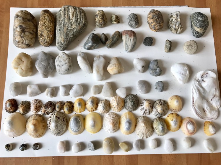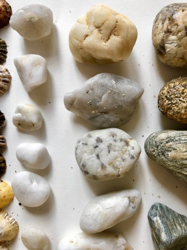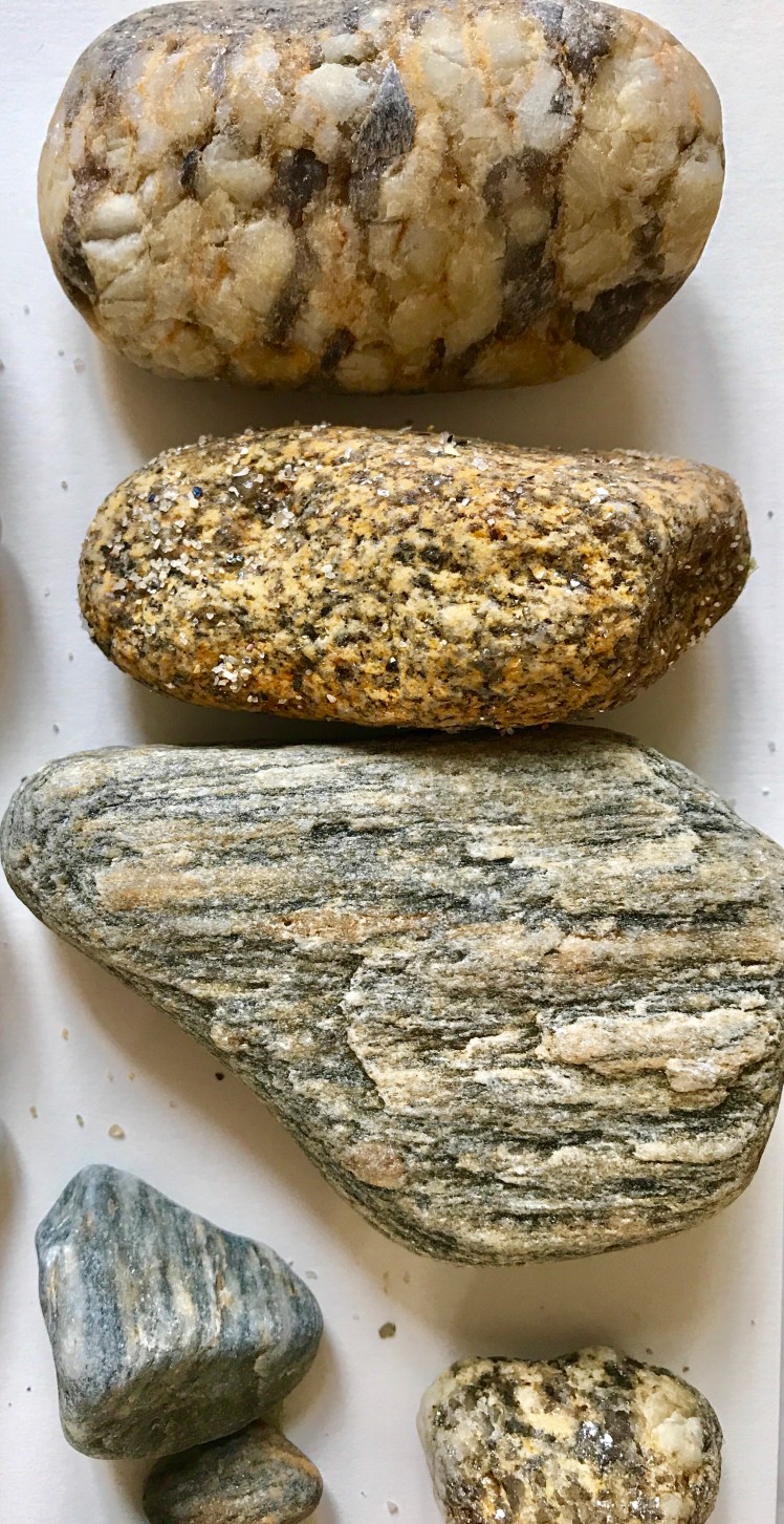 The rocks on this shore are granite and the pebbles are a mixture of colours and patterns or glassy smooth quartz ranging from pure white through to mustard or grey.