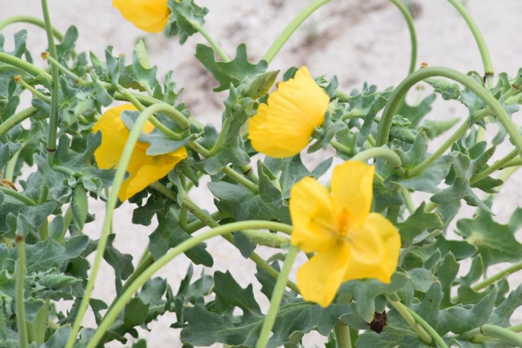 The horned poppy (Glaucium flavum), named after its long curling seed pods. When snapped the stem exudes a yellow sap which is poisonous.