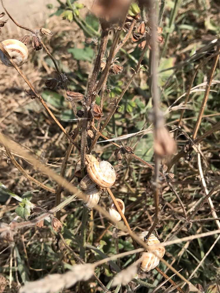 These snails Cernuella virgata also known as Helicella vulgata (the vineyard snail) easitvate on the tops of plants and fences.
