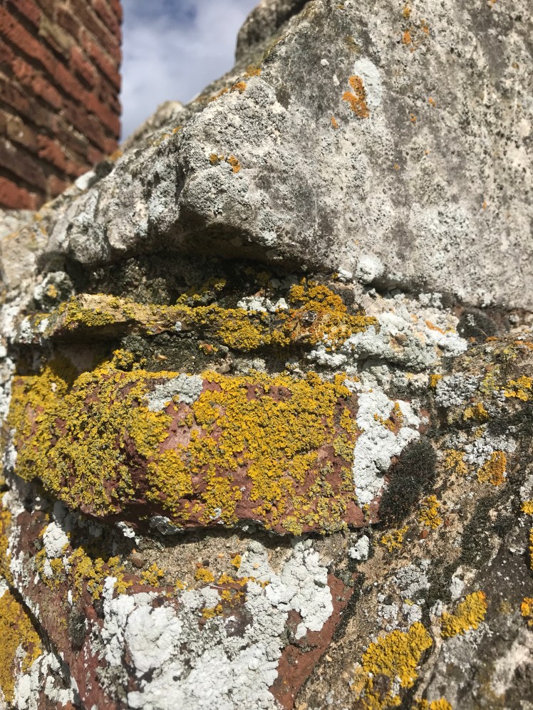 There was a group of historical re-enactors at the hall and earlier I had spoken to the brick maker. All the bricks were made on site and the hall took 20 years to build. These bricks were a perfect habitat for some crustose lichens.