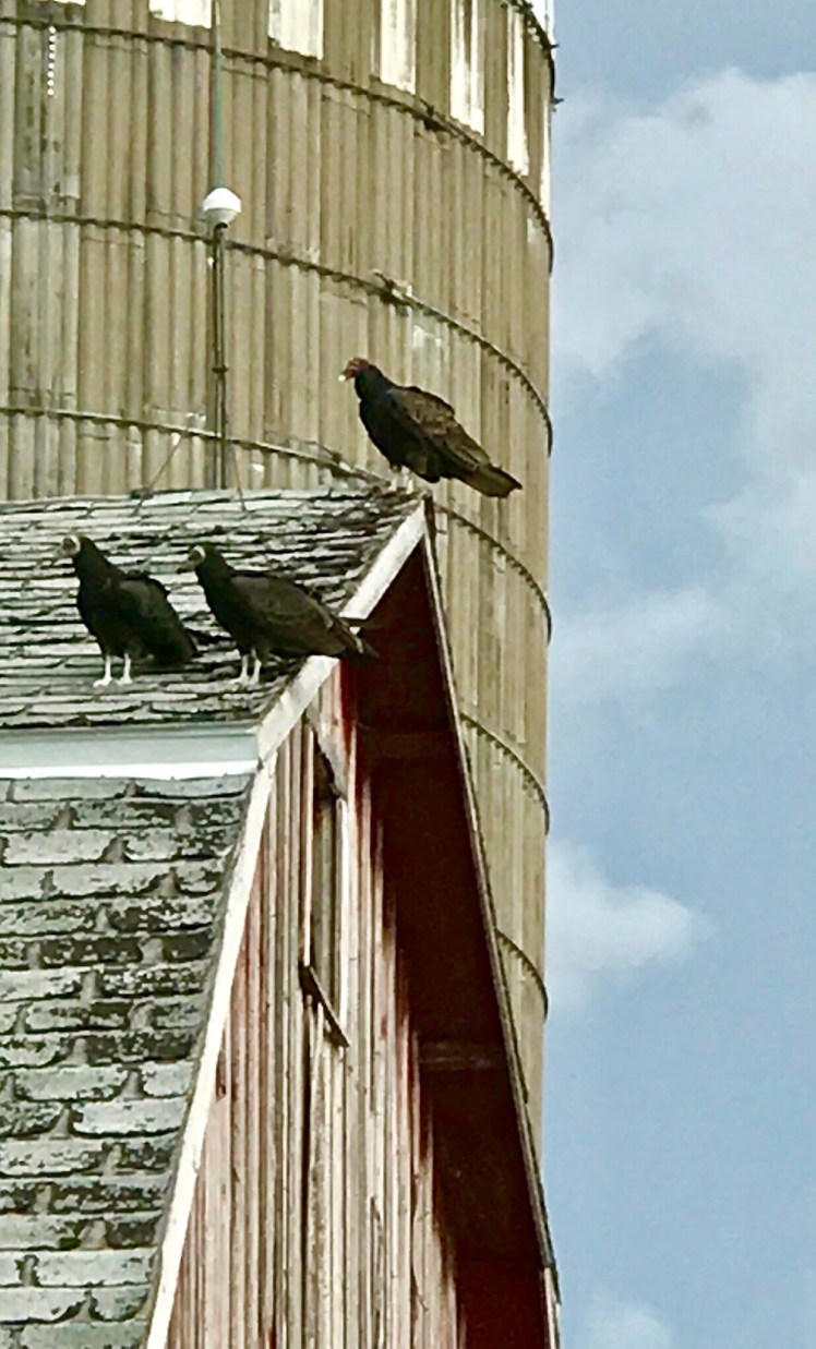 The second bird is the Black Vulture. The photo shows a group sitting on the barn roof.