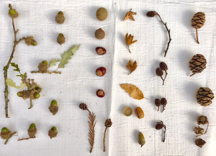 From Left to right:- Turkey Oak,Indian Horse Chestnut,Coast Redwood,Beech,Lebanon Oak, Alder, Giant Sequoia,Knopper Oak Gall.