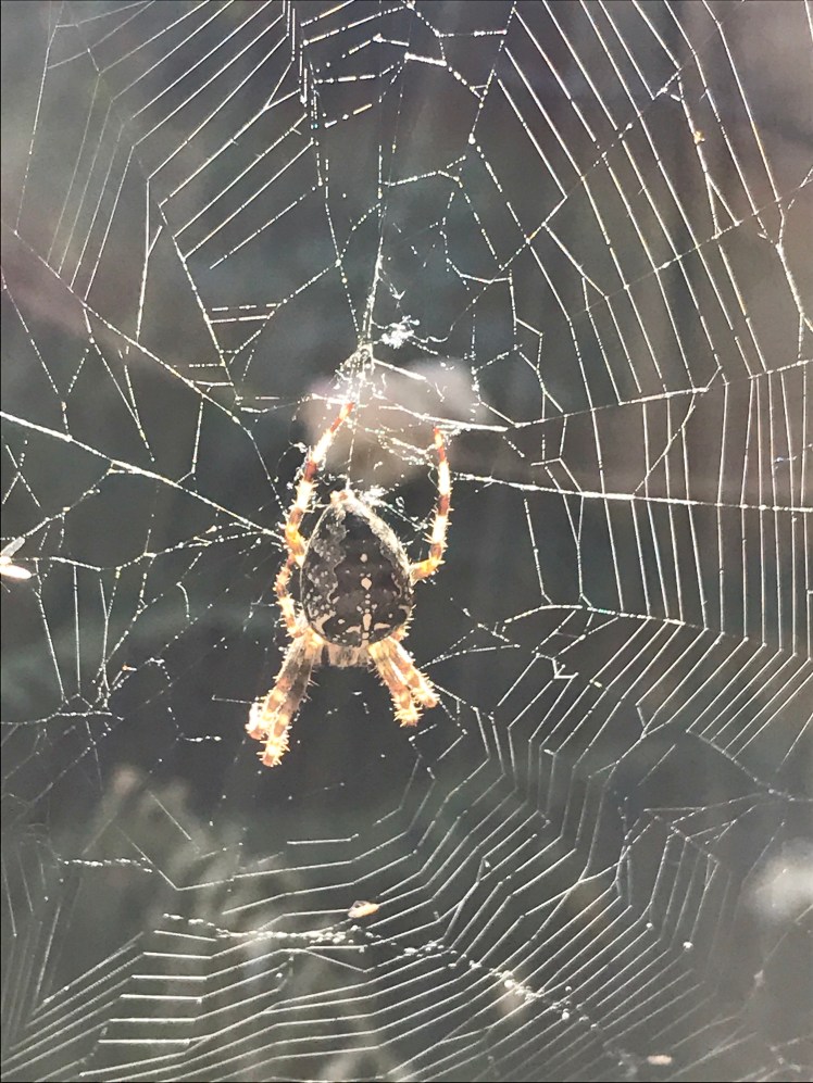 11am drinking a coffee in the gazebo at the back of the garden , a quick movement made me focus on the previously invisible web. This perfectly engineered food net was in a wind tunnel on the side of the gazebo and had caught a large fly bringing out the engineer to deal with its brunch.