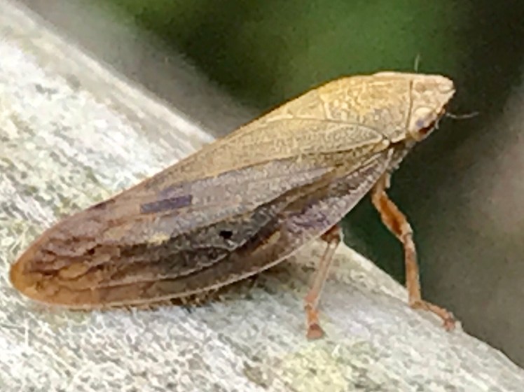 This froghopper is the spittle bug named (Neophilaneus lineatus)The eggs of froghoppers are laid in the foam we call cuckoo spit attached to plants in the spring and the first of three nymph stages hatches from here.