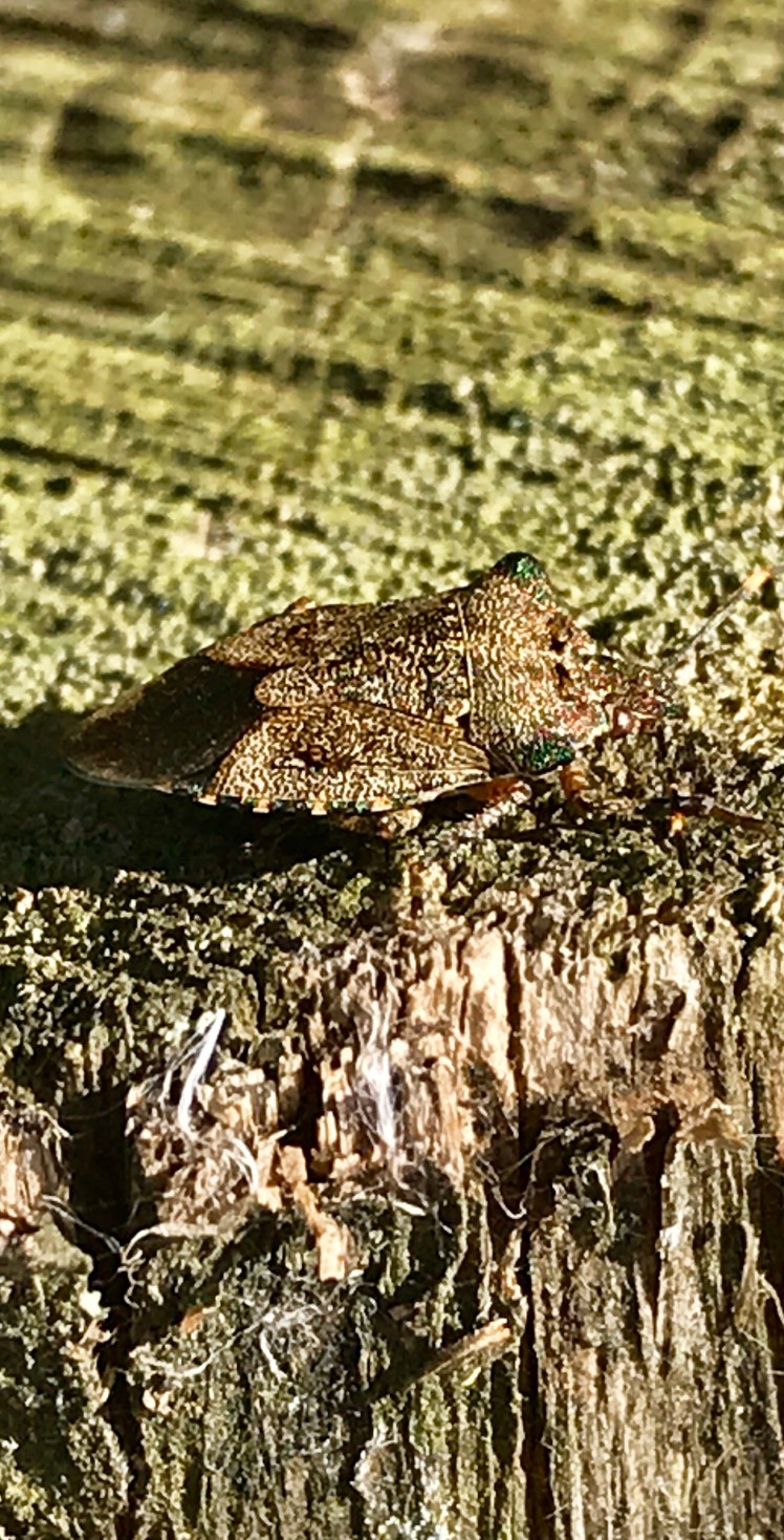Another interesting find on this October stroll was on top of the posts extremely well camouflaged , it was this fantastic shield bug.This is the bronze shield bug (Troilus luridus).It is a predatory shield bug whose nymphs feed on plants and other insects particularly caterpillars. There is one generation per year.