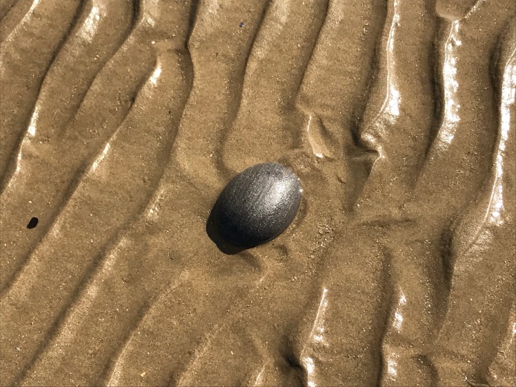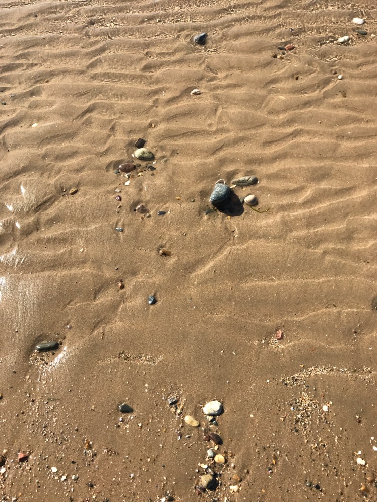 As you walk along the sand the ripples change from flat and soft to hard and relatively tall and then to areas of none at all. All the while at every step there are plenty of interesting thing to see. Pebbles of all sizes and rock types , crab shells , tiny shells and lots more.