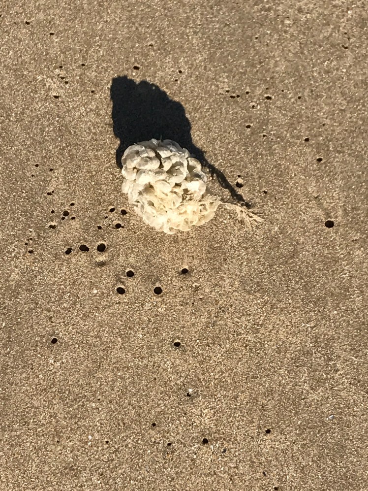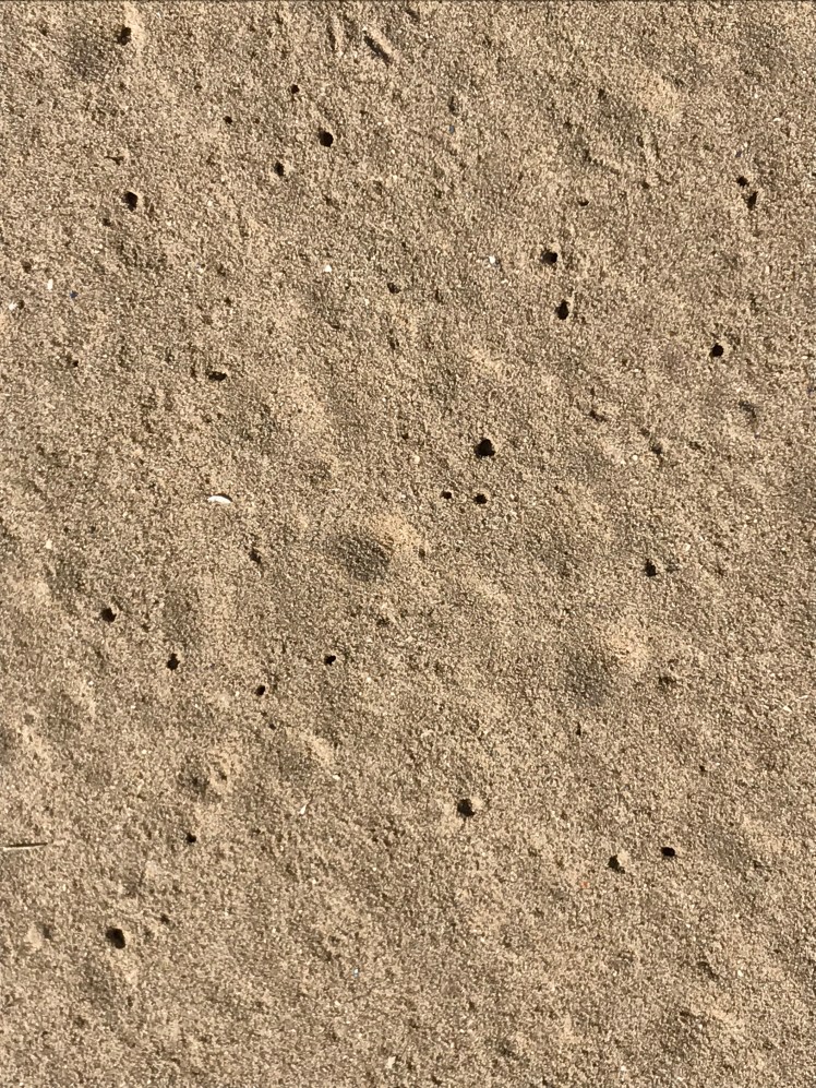 These tiny holes and mounds are evidence of worms in the sand , there are many animals living in the sand, worms, molluscs and sea urchins to list a few.We are walking above whole communities as we stroll across the sand.
