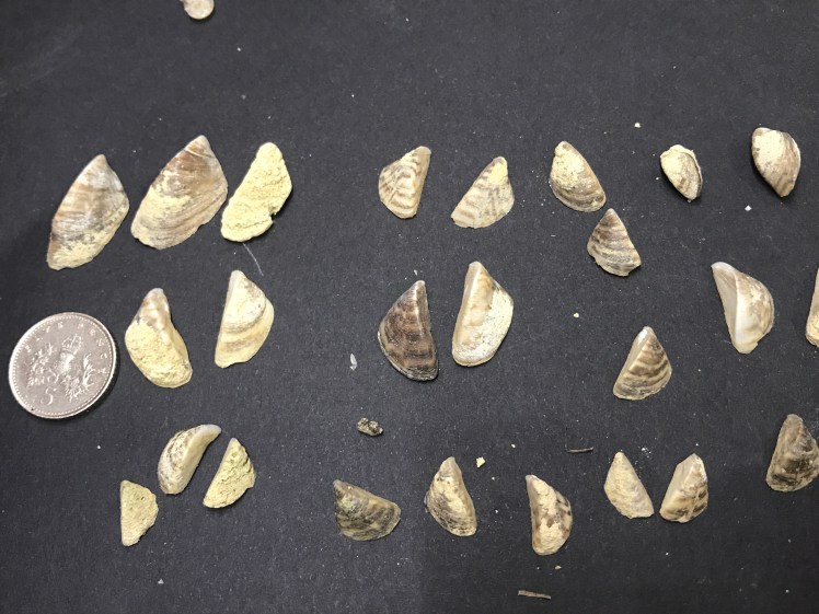 One of the shells, a bivalve that there were a lot of were zebra mussels these are an invasive species which threatens the native fresh water mussels.