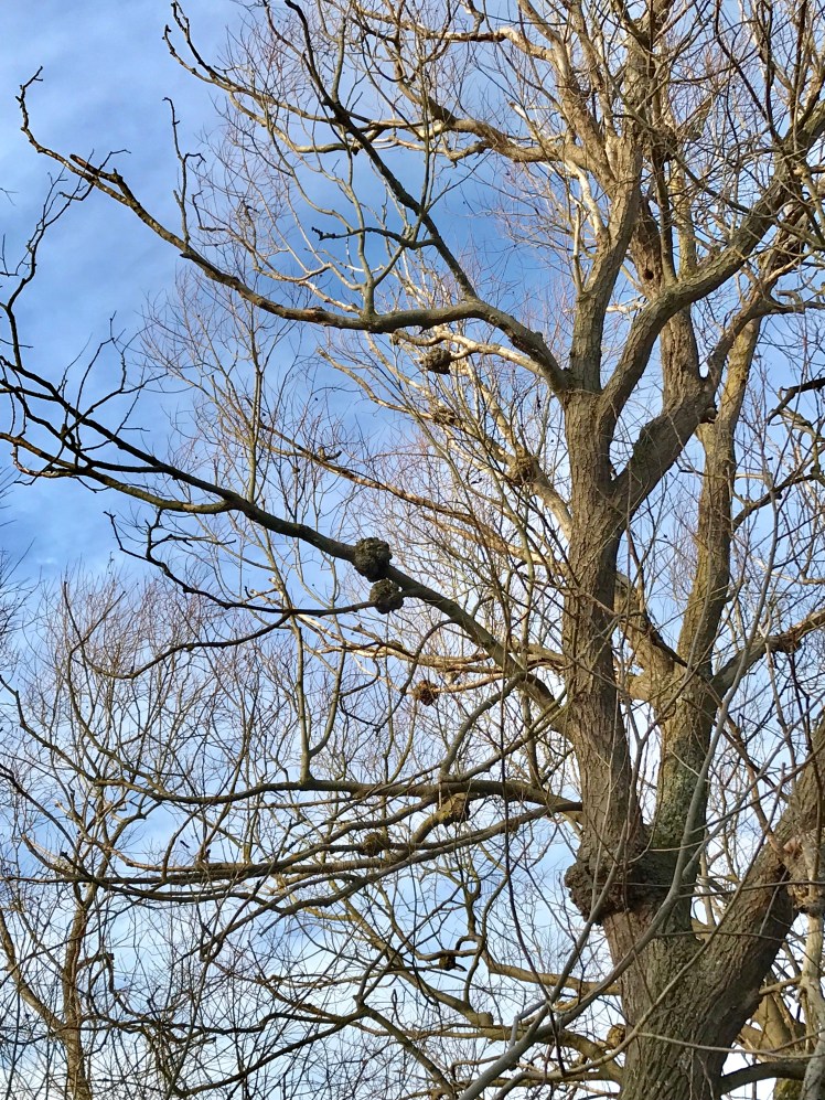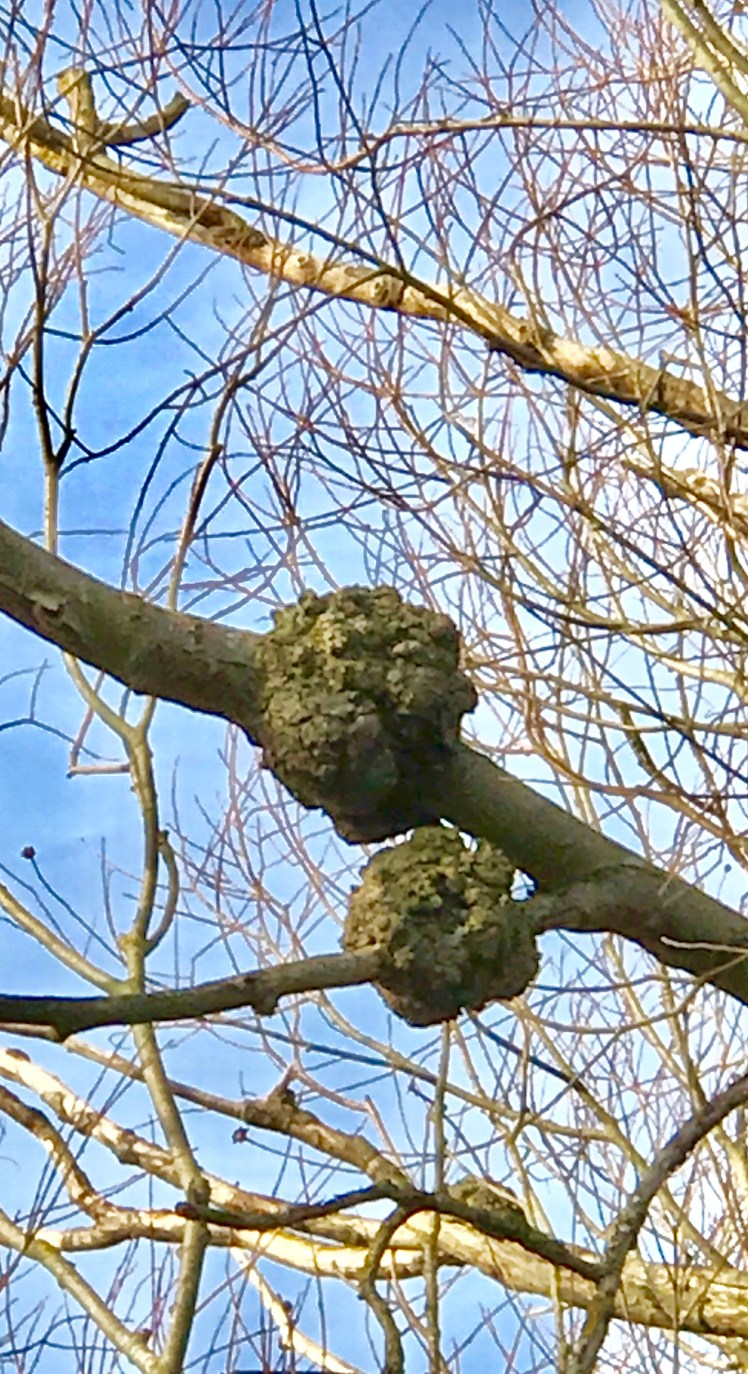 Other features of trees are apparent at the moment in this leafless month, signs of infection or fungal damage. This tree has cankerous growths giving it the appearance of swollen arthritic joints.