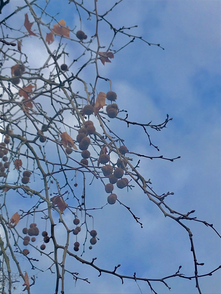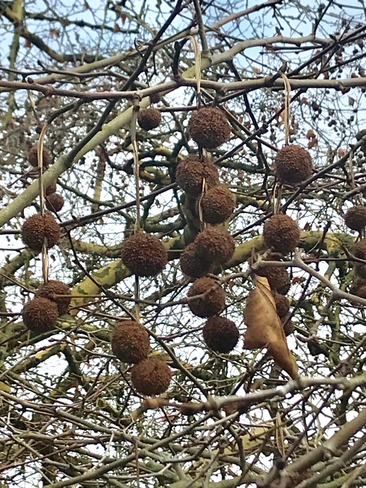 They are easy to identify as their bark is characteristically colours and flaky and they have spiky ball like seeds.