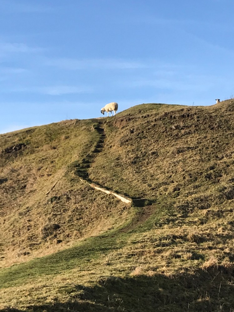 We strolled up to the castle mound . The sheep had control and one was definitely king of the castle !
