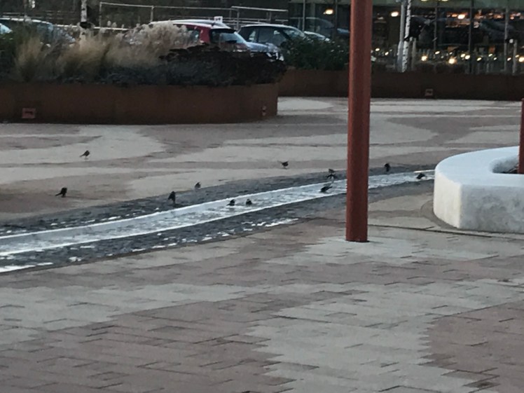 He is standing in a man made stream which is a feature of the development along with another 20 birds in constant motion in and out of the water splashing and bathing. It was absolutely freezing tonight.