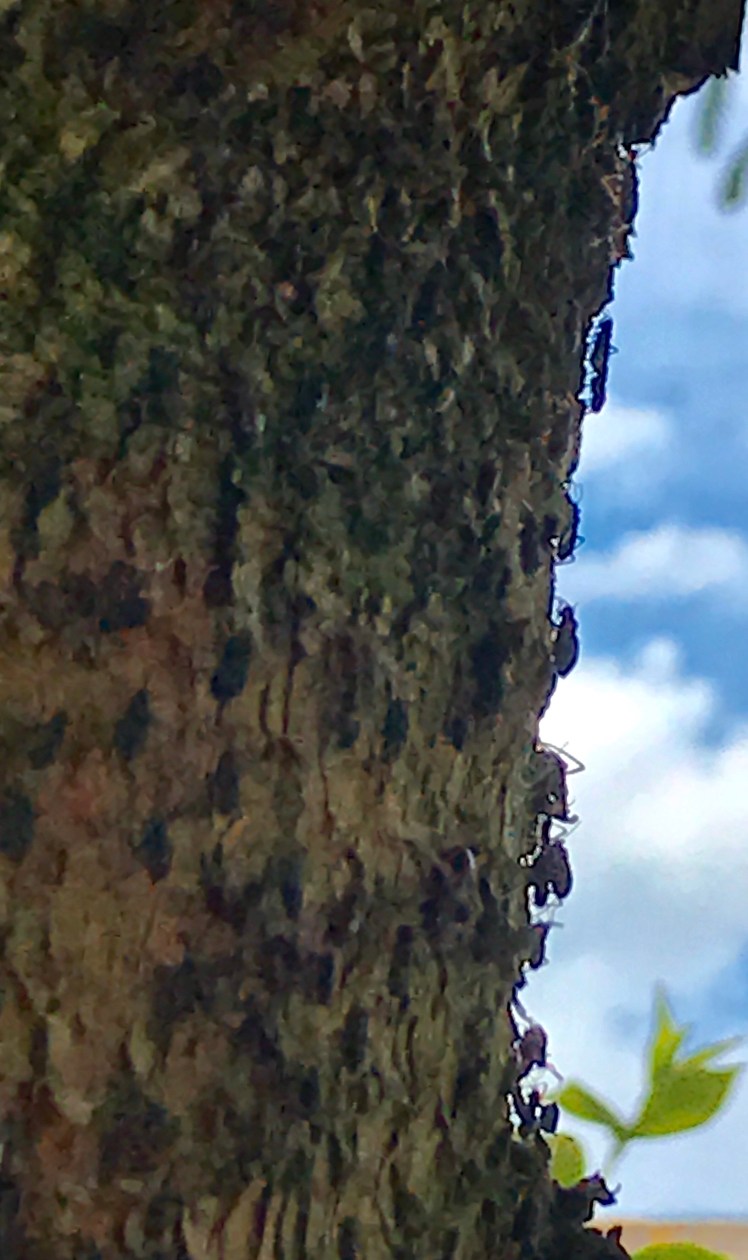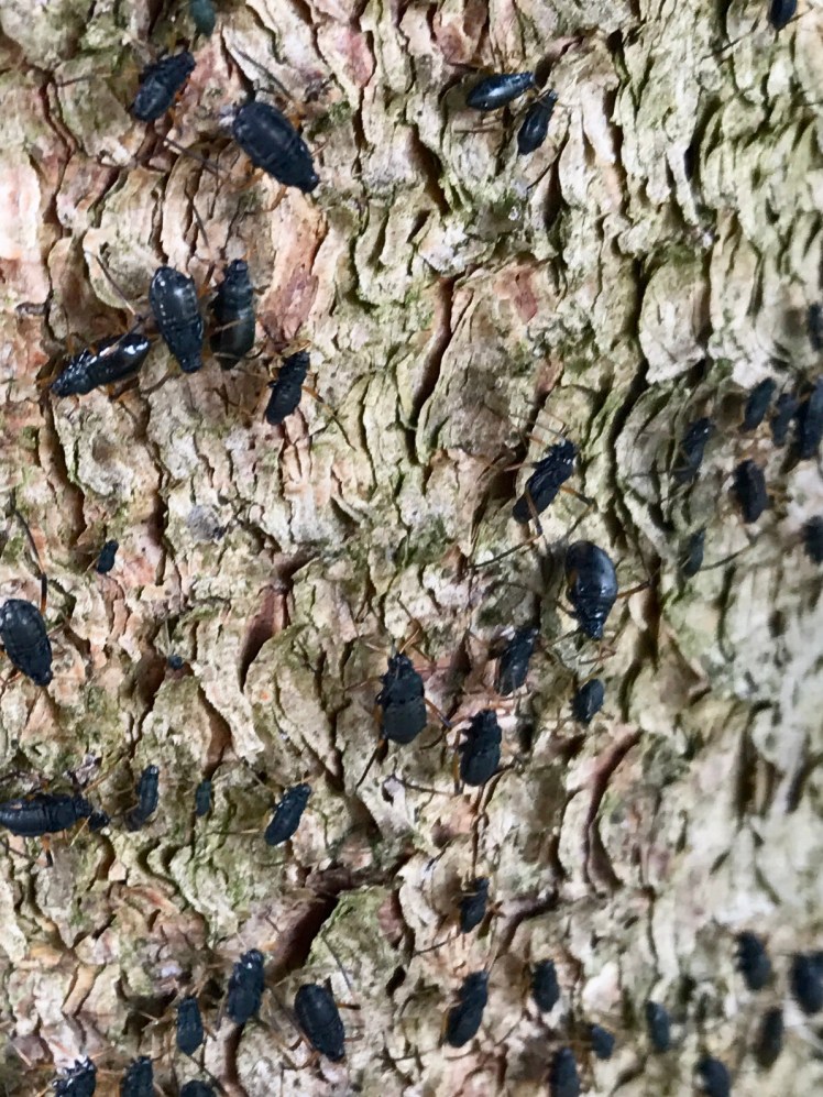 Looking up I was taken aback the whole pine trunk was moving with huge black aphids, they looked more like beetles they were so big!