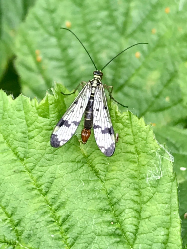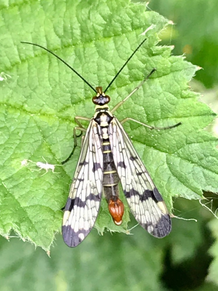 The insect finds continue, there were large numbers of these rather attractive flies. This is the scorpion fly ( Panorpa communis) the specimen in my photos is a Male , the scorpion tail end covers the genitalia it is not a sting.There are three species in Britain and they need careful identification with a hand lens. I am rather taken by these flies,the wings are very attractive.They feed on dead insects and steal from spiders webs !!