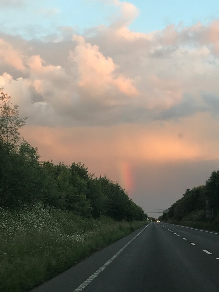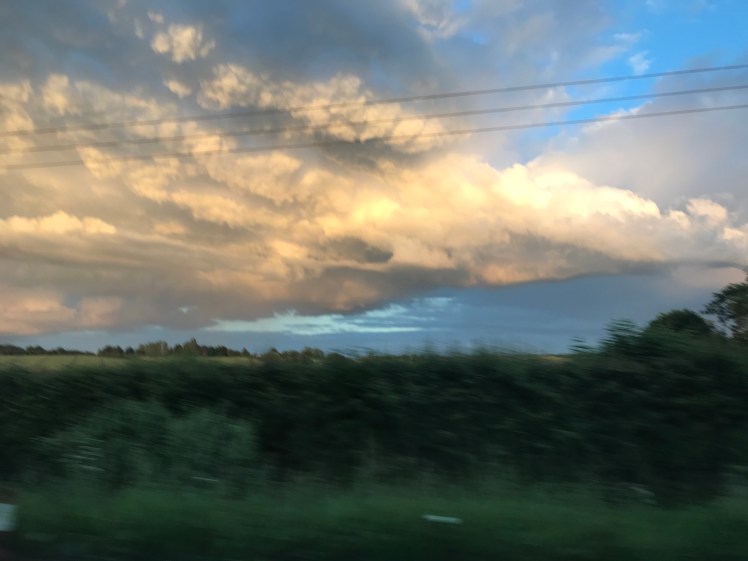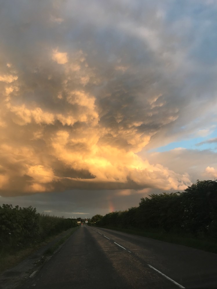 This huge cumulonimbus cloud with spurting rainbows was looming over us as we drove home. These huge towering clouds with their flat tops and anvil shapes are full of thunder and rain ( we have had a lot of that) The sky was stunning.