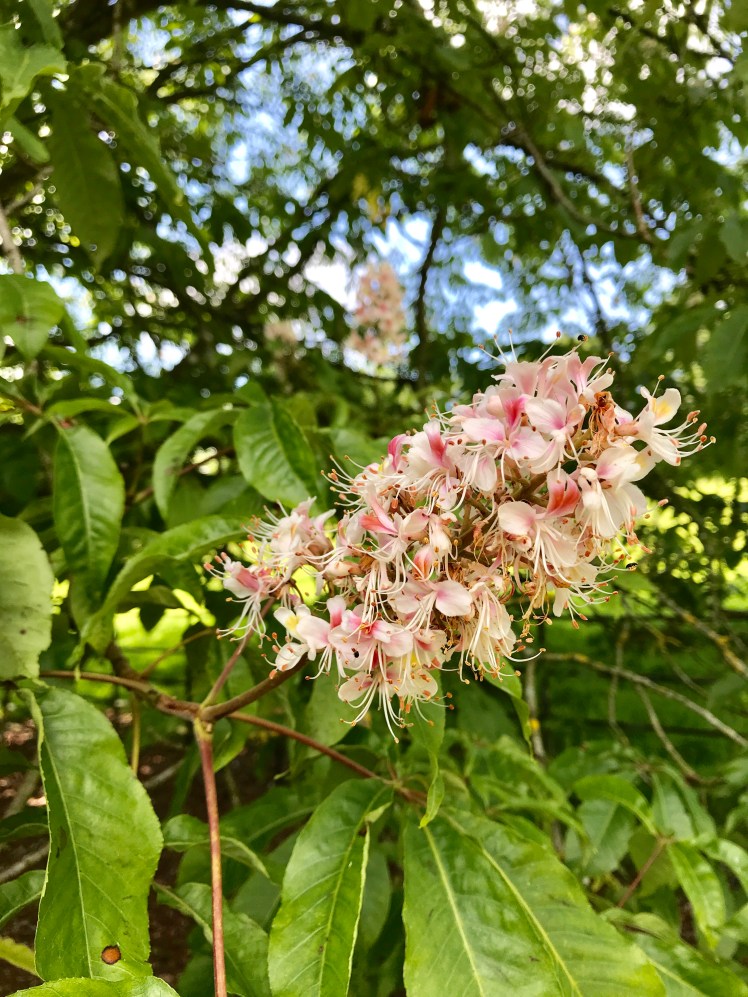 From here I walked to the old sheep pool where sheep were cleaned which is now a swamp/ bog garden full of huge leave plants and surrounded by bamboos. Walking along the higher ridge on the hill you can look down onto the Manor House. There are huge pines and conifers , spruces and redwoods. Along the path there are a number of Indian horse chestnuts. The flowered are lovely.