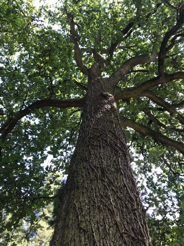 English Oaks tower over you as you descend .