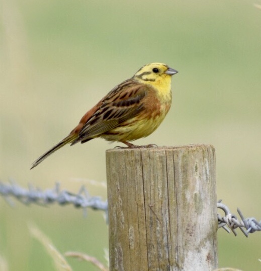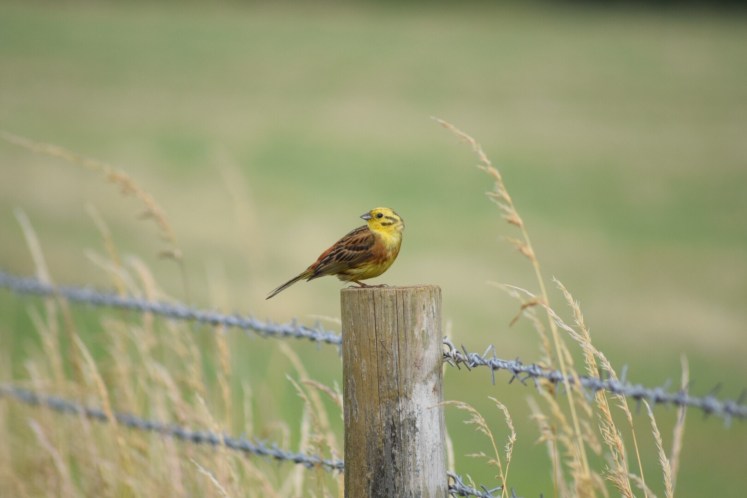 This is a yellow hammer (Emberiza citrinella) The one in the post is a Male with a distinctive yellow head. They are often spotted like this one sitting on a post or perch singing. They eat seeds and insects.