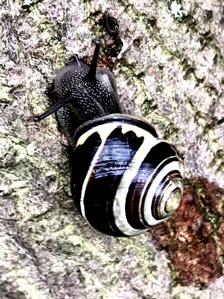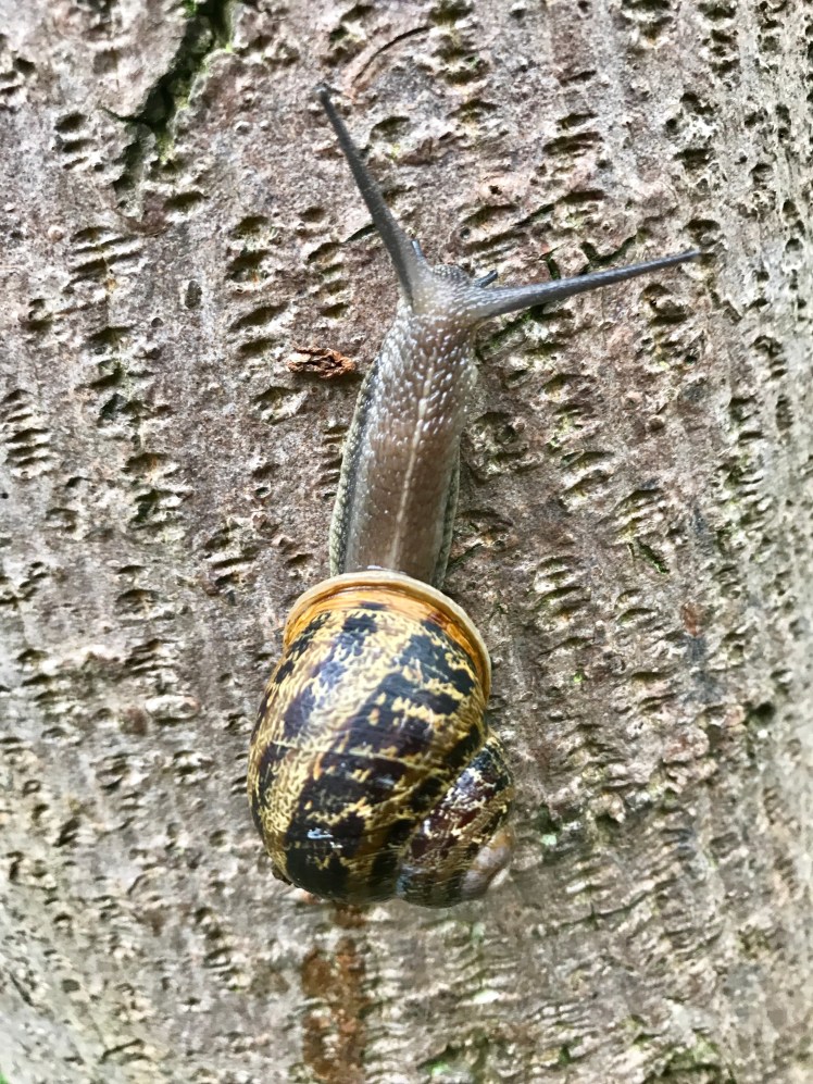 After rain over night the snails were out in force. They were climbing up trees all around the lake. Slugs were criss crossing the paths below.