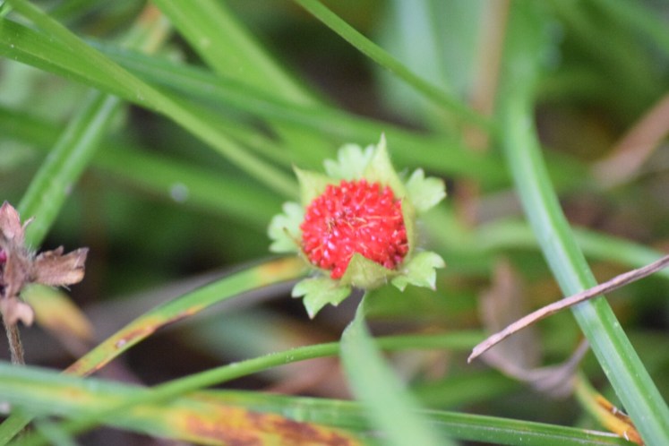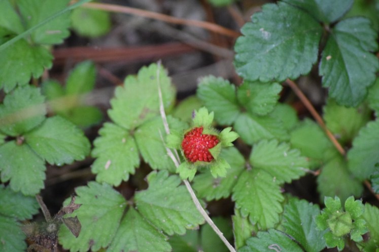 Wild strawberries (Fragaria vesca)are tiny blood red spots in the undergrowth. They were growing in large numbers forming polka dot carpets in the woodlands around Agatha Christie’s summer home along the banks of the river Dart.