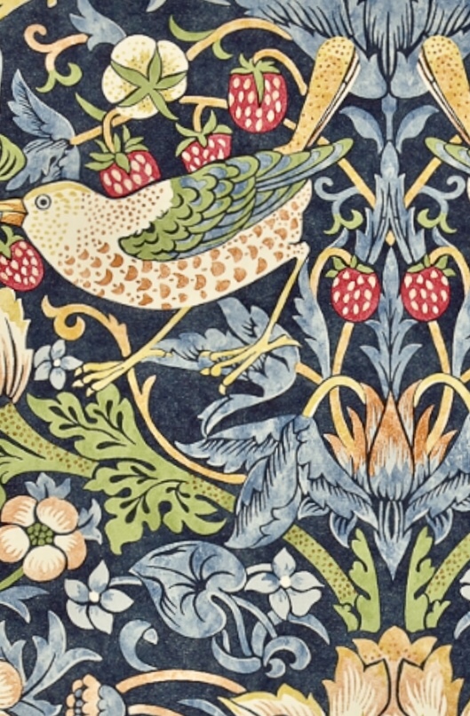 Wild strawberries have glossy trefoil shaped leaves which have toothed edges. The fruits are tiny and bright red. The wild strawberry is part of a famous William Morris textile design called the ‘strawberry thief.’