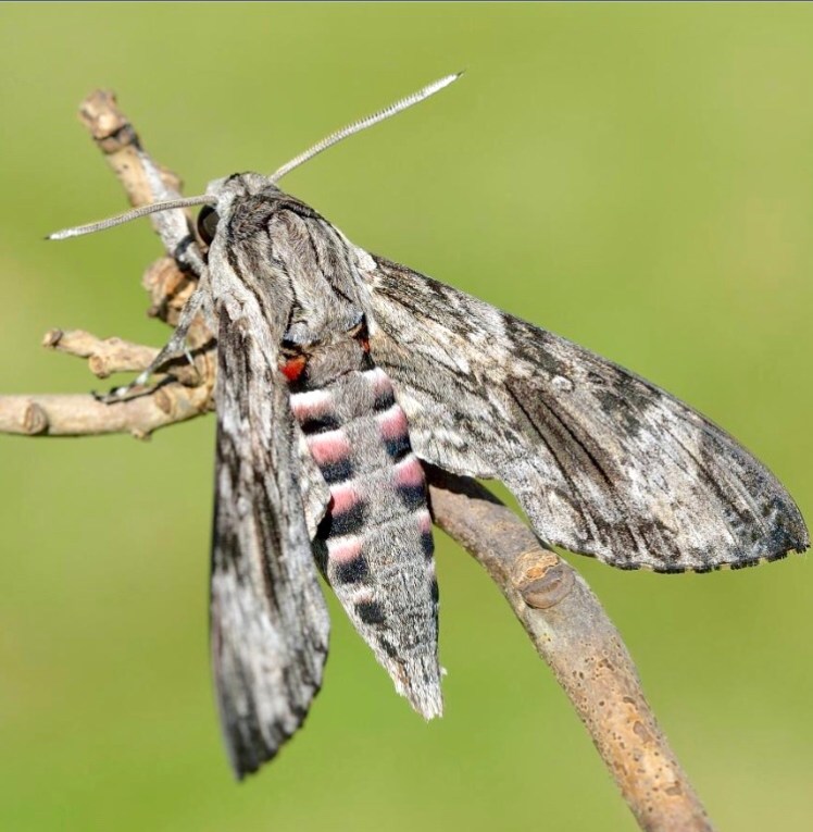 The convolvulus hawk moth (Agrius convolvuli) is a migrant to Britain. It cannot overwinter in this country but is often found in large numbers in the south and east of Britain and has been found in the Shetland isles. It is a night flyer with a very long proboscis so can reach the nectar in the nicotiana flowers. In the day it rests on surfaces such as walls and trees. The larvae feed on convolvulus .