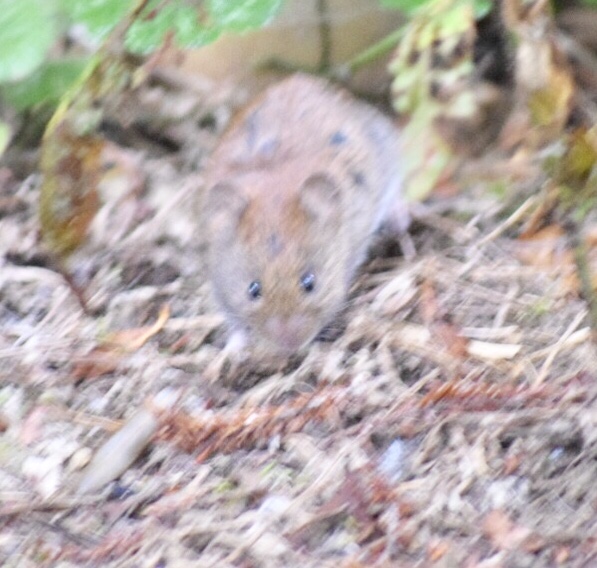 Further on on this walk a small furry creature darted our in front of us. Standing watching it continues this in and out behaviour for 4 more sorties. It was a bank vole.The photo is not very good it seemed to be in constant motion.