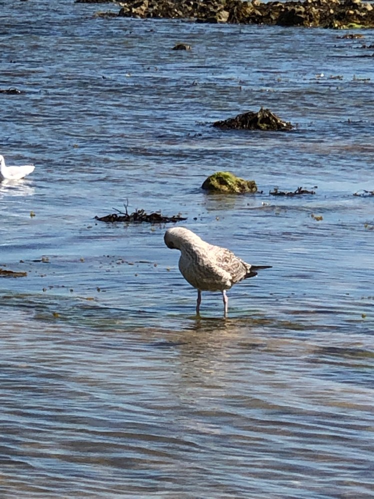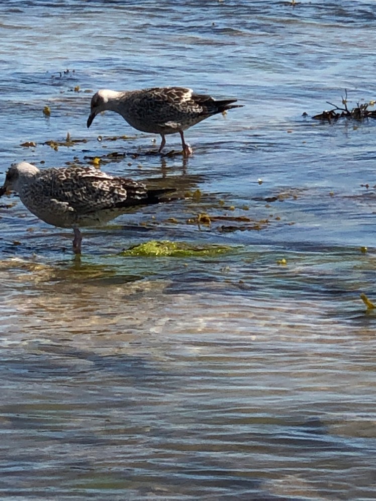 At West Runton we swam in the sea which was clear , our only company were the young gulls and the cormorants sitting in a stone bank.