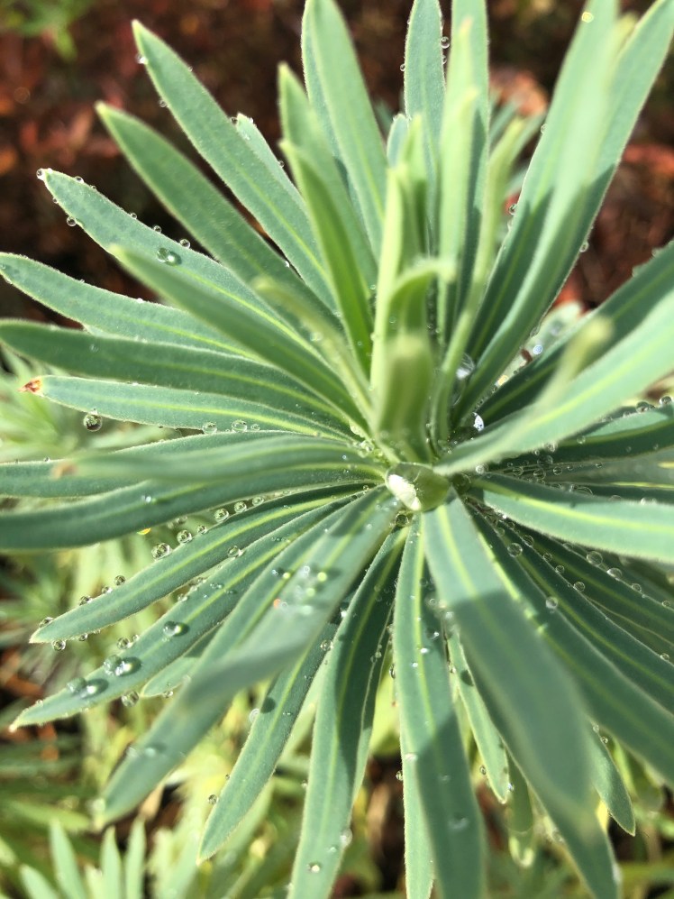 Water sits on the surface of leaves and plants in different ways, the waxy or sometimes hairy stem and leaf surfaces hold the water in droplets.