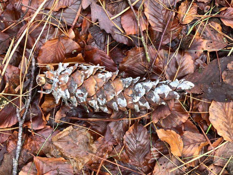 Most of the autumn leaves carpeting the ground are losing their colours and starting to break down. It’s always worth looking under trees, this beautiful cone was lying in a carpet of leaves.