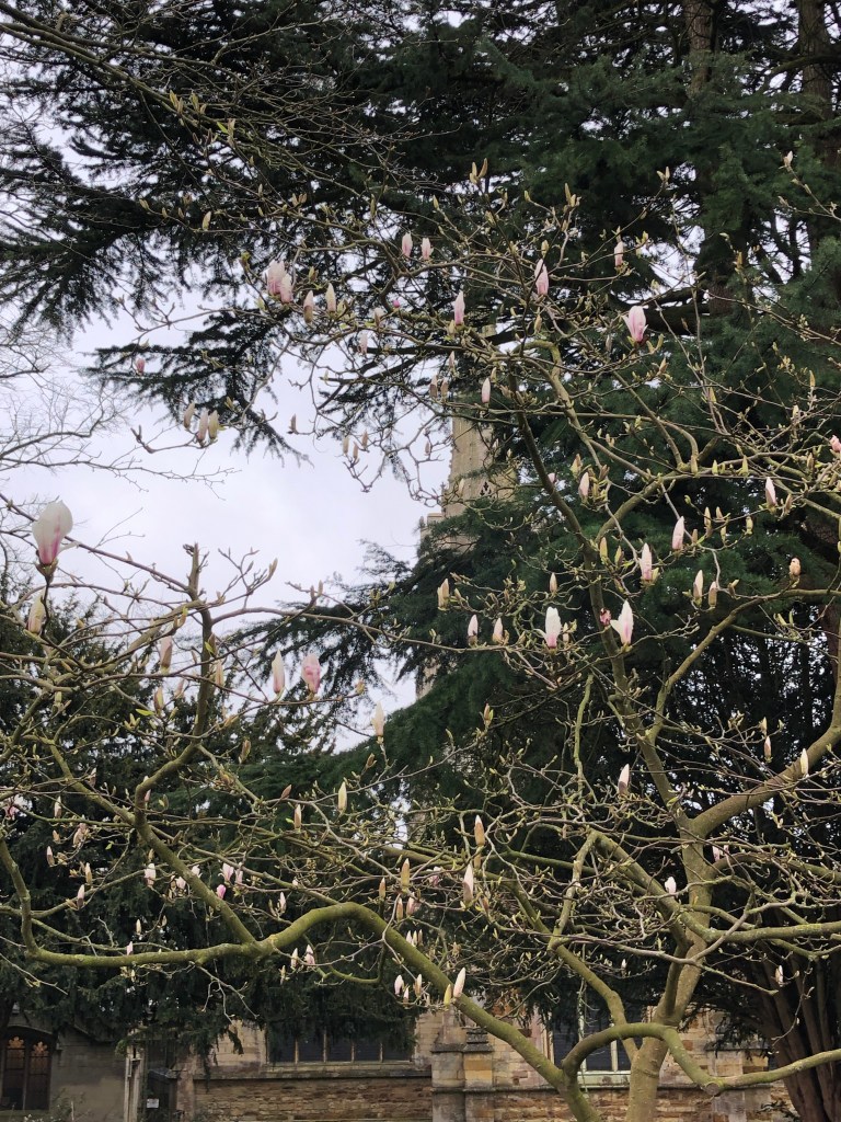 A spring day , blossom is bursting out all over and the Magnolias are in flower in the grounds around Kettering church.