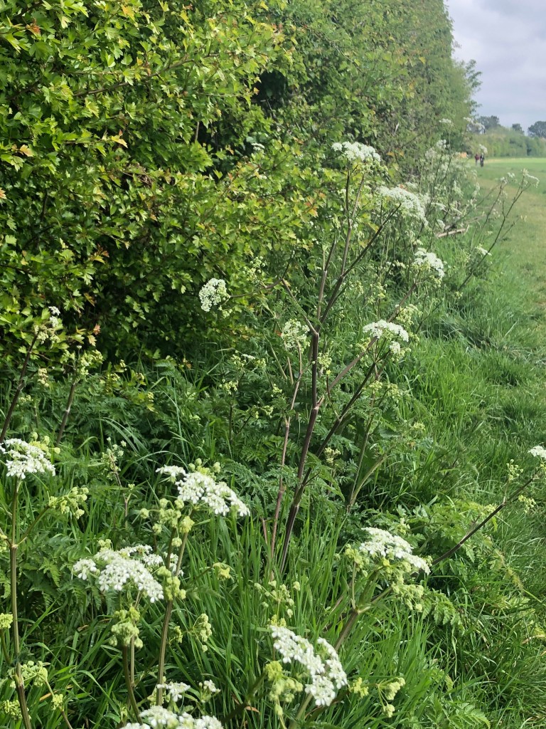 This walk skirts the edge of this huge field following a hedge at the back of houses. The hedges are full of noisy birds flitting in and out as you walk by. The grassy verges are now starting to flower with frothy cow parsley , delicate and very pretty.