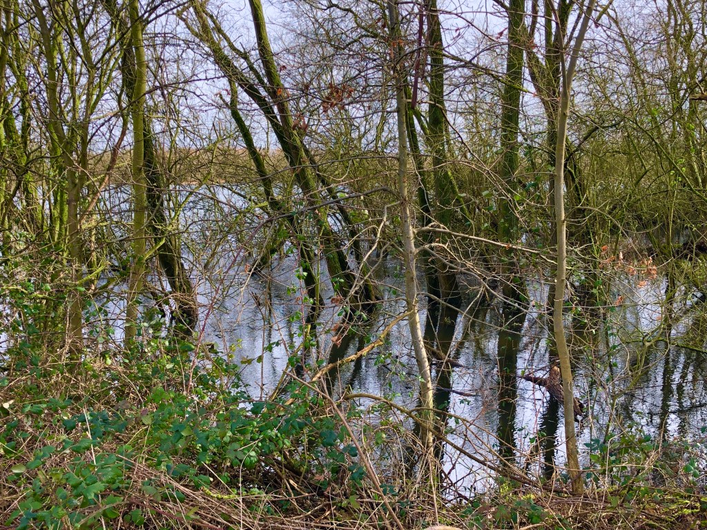 The River Nene flows behind these gravel pit lakes and it has burst it’s banks and created new wet areas. Herons are standing in them as well as the coots and moorhens and ducks.