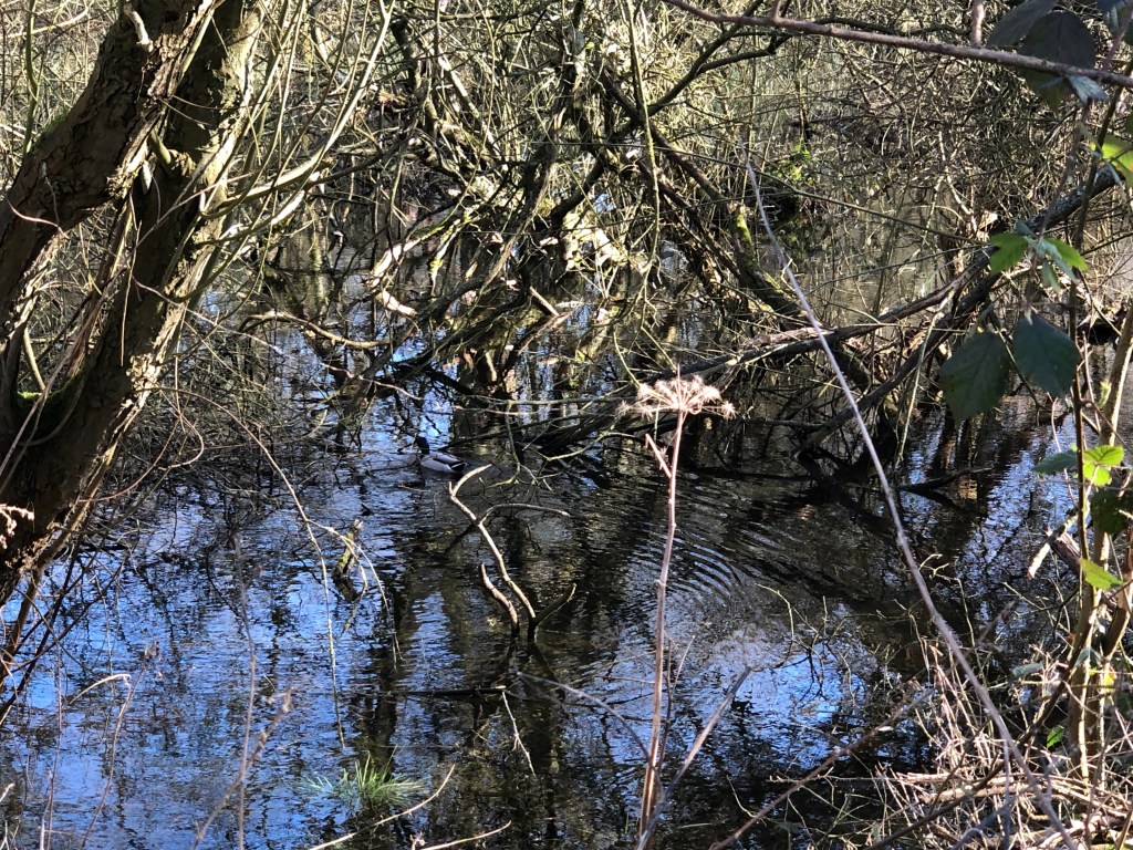 This was a bright day and a noisy walk, the birds were busy and very vocal. Standing in a wooded area right next to a lake a flock of goldfinches were incredibly loud . There were great tits , blue tits and long tailed tits in large numbers as well. I like this small wooded area it always has something interesting to discover.