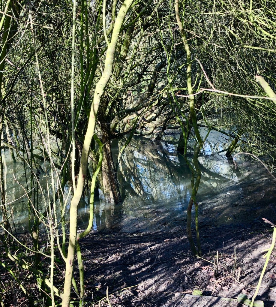 Sunday was bright and dry and skies were blue. The woods and meadow areas were however transformed into watery worlds by the rain of the past three weeks.