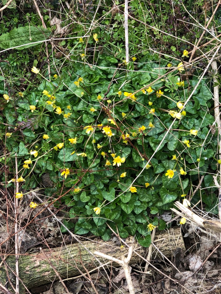 A walk through a small green space into the local park was rewarded with a show of celandines shining in the sun. The ditches along the hedge were full of them.